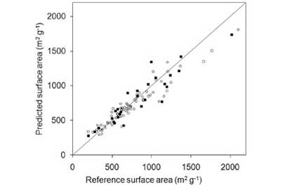 通過這個(gè)方程的表面積預(yù)測(cè)測(cè)試了新的樣品,考慮了我們獲得的文獻(xiàn)和數(shù)據(jù)中的數(shù)據(jù),總共78個(gè)測(cè)試樣品。在圖2中示出了由等式4預(yù)測(cè)的值與實(shí)驗(yàn)獲得的BET值之間的比較。