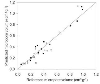 由于微孔由于其尺寸而優(yōu)先被碘分子存取,所以碘值也通過最小二乘回歸與微孔體積直接相關(guān)。然而,所獲得的誤差要高于考慮亞甲藍(lán)和碘值時(shí)的誤差。這表明亞甲藍(lán)在微孔體積預(yù)測(cè)中有一定貢獻(xiàn),可能是由于在較大微孔中的吸附。