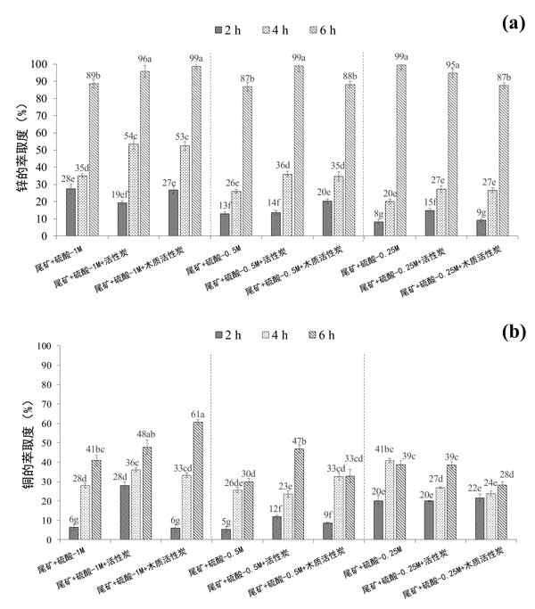圖1:活性炭在4小時(shí)和6小時(shí)后鋅(a)和銅(b)的提取程度。