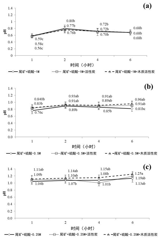 圖2:H2SO4-1M樣品中的pH變化(3a),H2SO4-0.5M(3b)和H2SO4-0.25M(3c)。