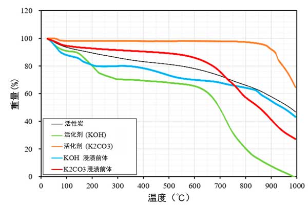 圖1:用每種化學(xué)品浸漬的化學(xué)試劑和碳前體的熱重分析結(jié)果。