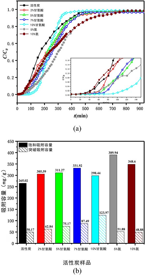 測(cè)試了選定的甲苯VOC對(duì)活性炭的吸附性能。在每個(gè)實(shí)驗(yàn)運(yùn)行中,甲苯通過裝有活性炭的吸附管直到達(dá)到平衡,即活性炭吸附劑被甲苯飽和。圖2(a)所示的穿透曲線呈現(xiàn)為甲苯吸附量吸附(ç/ç0)與接觸時(shí)間(噸,分鐘)六種的活性炭正在進(jìn)行中,它們的飽和和突破吸附容量如圖2所示(b)。從吸附曲線可以看出,甘氨酸修飾的活性炭的穿透時(shí)間明顯延長(zhǎng),而飽和氨改性活性炭的時(shí)間延長(zhǎng);钚蕴可霞妆酱┩肝侥芰Φ捻樞?yàn)?0%甘氨酸改性活性炭>7%>5%>2%>5%氨改性活性炭>未改性活性炭>10%氨改性活性炭,而活性炭對(duì)甲苯飽和吸附容量的順序如下:5%氨改性>10%>7%甘氨酸改性>5%>2%>10%>未改性活性炭?梢姼拾彼嵝揎棇(duì)甲苯吸附有顯著的正向影響。與原來的AC相比,甘氨酸改性的活性炭對(duì)甲苯的突破吸附能力分別提高了25%、50%、74%和147%,隨著甘氨酸濃度的增加呈上升趨勢(shì)。同時(shí),甘氨酸改性的活性炭對(duì)甲苯的飽和吸附容量分別增加了15%、17%、25%和13%,且隨著甘氨酸濃度的增加先增加后減少。5%和10%的氨改性也提高了甲苯的吸附性能,但其優(yōu)勢(shì)主要體現(xiàn)在飽和吸附容量上,與原來的活性炭相比,分別提高了47%和32%。