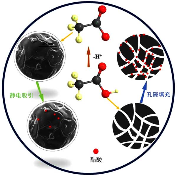 活性炭對乙酸的吸附機理如圖3所示。結合上述吸附實驗和表征結果,吸附過程可能包括多個方面。首先,活性炭在足夠多的孔隙中可以發(fā)生孔隙填充效應,從而有效地吸附乙酸。其次,活性炭和乙酸之間存在靜電引力。在較高pH的溶液中,活性炭表面具有更多的負電荷,導致CH3COO-與活性炭表面之間的靜電排斥更強。