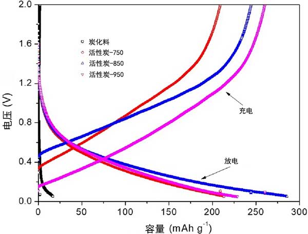 圖3:炭化料和活性炭的放電/充電曲線。