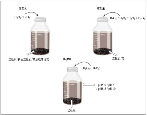 在對50家飲用水公用設施進行的調查中,獲得過氧化氫和溴化物的平均值來當做測試用水。在所有實驗中,批量反應器都用薄箔包裹。制備0.052µmol/L溴酸鈉溶液并加入間歇反應器中以獲得0.5µmol/L溴酸鹽的濃度。高級氧化工藝中的出水殘留過氧化氫濃度不會超過180µmol/L。因此,在本研究中,將150µmol/過氧化氫加入到間歇式反應器中。如圖1所示,在23–27℃的環(huán)境溫度下,使用36個批次玻璃瓶進行了一系列實驗。活性炭用量始終為5g/L,過氧化氫和溴酸鹽濃度始終分別為150µmol/L和0.5µmol/L。所有裝有過氧化氫的間歇式反應器都用鋁箔覆蓋,以防止過氧化氫被光潛在降解。在如圖1所示的實驗中,使用16個間歇式反應器和三種不同的活性炭(活性炭、再生活性炭和預加載活性炭)來研究不同運行時間的活性炭對溴酸鹽和過氧化氫的去除,該實驗涉及八個處理組。