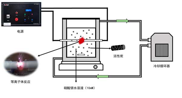 研究中用于制備銀納米顆粒沉淀活性炭的液相等離子體裝置在圖1顯示。使用左上角的電源為安裝在石英反應(yīng)器中心的鎢電極供電。此時,脈沖寬度為5μs,施加電壓為250V,頻率在30kHz的運行條件下運行。液相等離子體反應(yīng)器采用雙管式制造,為防止等離子體產(chǎn)生的熱量導(dǎo)致溫度升高,在反應(yīng)器外通道循環(huán)冷卻水,使反應(yīng)溶液的溫度保持恒定在15℃。
