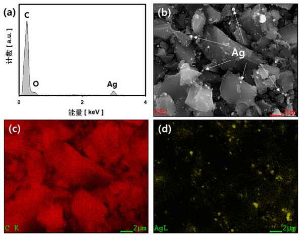 圖2:活性炭載銀復(fù)合材料的FE-SEM和EDS分析結(jié)果:(a)EDS光譜,(b)FE-SEM實像和(c)碳元素映射圖,(d)Ag元素映射圖像。