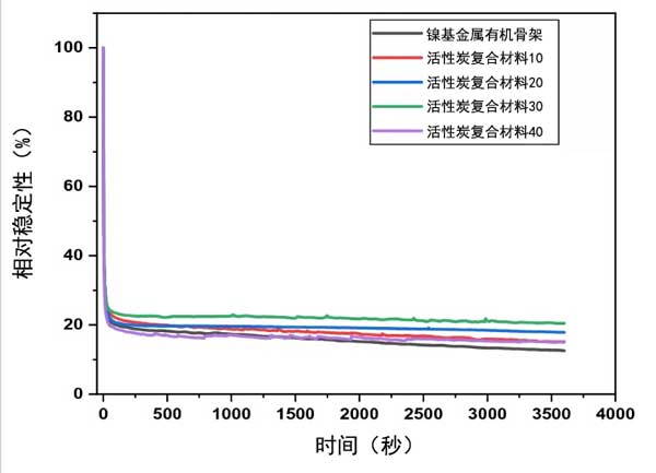 圖3:金屬框架及其復(fù)合活性炭在KOH和甲醇中的相對穩(wěn)定性曲線。