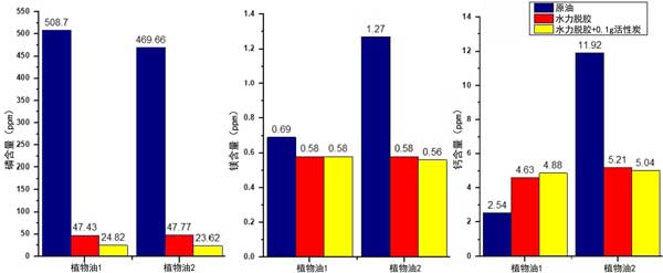 磷含量在兩個(gè)兩種植物油中主要由以所示的處理(水重量2%+活性炭0.1克)后減少圖2。植物油1的磷含量降低了大約95.22%,而植物油2的磷含量降低了大約相同的值(94.98%)。油液經(jīng)水脫膠后Mg、Ca含量略有下降,而Ca處理后略有升高。這一結(jié)果可能是由于在處理過程中活性炭中存在一些Ca解離回油相;钚蕴繉(duì)磷含量的大量降低是由于NaOH改性的活性炭具有極性、帶正電荷的表面。由于存在芳環(huán)簇和固有缺陷,它還具有磁力。在脫膠過程中將活性炭添加到植物油和水中時(shí),活性炭的芳環(huán)簇中的離域電子產(chǎn)生磁矩,強(qiáng)烈誘導(dǎo)磷脂磷酸頭部周圍的順磁性氧。同時(shí),活性炭的極性/親水性也允許與極性水分子相互作用。水分子也被磁場(chǎng)激活,從而發(fā)生氫自旋從旁水到鄰水的重新定向,從而降低水的抗磁性。活性炭誘導(dǎo)的這種磁場(chǎng)會(huì)導(dǎo)致表面張力降低,削弱水分子的分子內(nèi)能。結(jié)果,更多的水分子被分解成H+離子和OH-離子,促進(jìn)更多水解反應(yīng)。這些現(xiàn)象與其他力量相結(jié)合:熱能和離心也會(huì)引發(fā)磷脂分子內(nèi)的鍵斷裂,導(dǎo)致磷酸頭部基團(tuán)從磷脂分子上分離(脫磷脂)。
