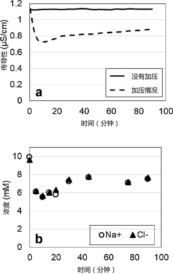 圖2:在離子去除實驗(電壓1.2V,活性炭厚度10mm,進水10 mM NaCl aq,壓力677kPa)期間,電導率和(b)Na+和Cl-濃度隨時間的變化(a)。