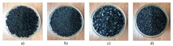 圖2:作為過濾介質的吸附劑,a-果殼活性炭,b-煤質活性炭,c-木質活性炭,d-椰殼活性炭。