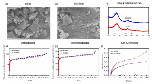當(dāng)原活性炭經(jīng)受0.1mol/L、0.5mol/L和0.8mol/L高錳酸鹽,煅燒溫度為400℃、500℃、800℃,煅燒時間為2小時,5小時和7小時。通過三因素三水平正交試驗和極差分析篩選出改性活性炭的合適組合。改性后觀察到活性炭表面形態(tài)發(fā)生顯著變化,分別如圖1(b)所示。改性前的活性炭表面有較大的團聚顆粒,表面沒有明顯的孔隙結(jié)構(gòu)。改性后表面粗糙,呈不規(guī)則凸起的刺狀顆粒結(jié)構(gòu),孔隙結(jié)構(gòu)發(fā)達。改性前后活性炭的XRD圖如圖1(c)所示;钚蕴扛男郧昂蟮姆逍蜗嗨,但一些峰出現(xiàn),另一些峰消失。圖1(d)和1(e)分別顯示了活性炭改性前后的吸附和解吸等溫線。它們整體呈隨P/P0增加的趨勢,吸附量增加,但在相同情況下,改性活性炭的吸附能力更強。圖1(f)為改性前后活性炭的孔容孔徑分布,改性后的活性炭孔體積更大。改性活性炭的比表面積是活性炭的兩倍,累積吸附總孔體積是活性炭的1.72倍。