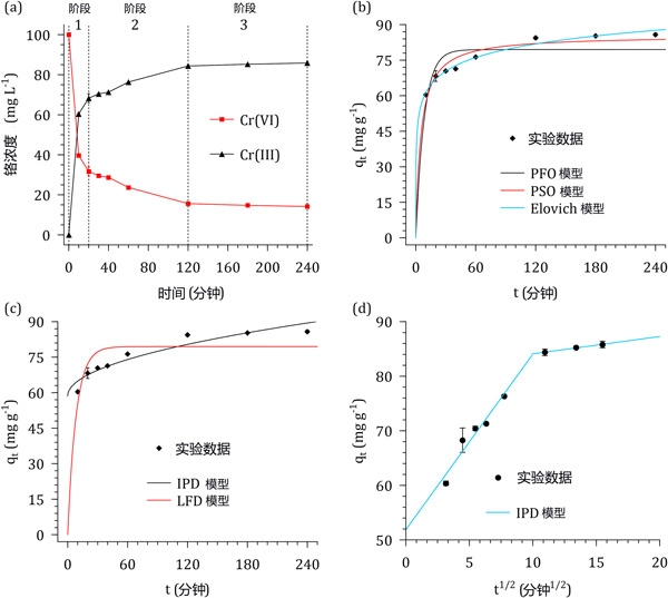 圖2:(a)六價鉻溶液和浸漬活性炭接觸時間對Cr濃度和形態(tài)的影響。(b)反應(yīng)動力學模型、(c)擴散模型和(d)線性化的顆粒內(nèi)擴散模型。