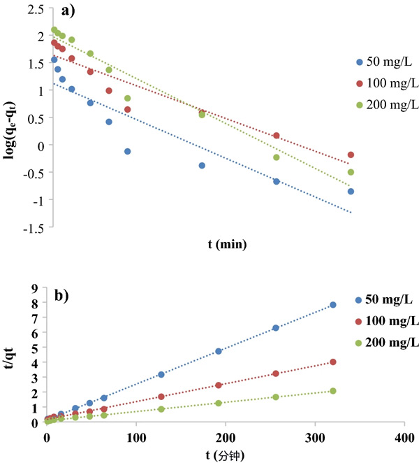 圖3:( a )活性炭吸附高錳酸鉀的一級動力學(xué)模型和( b ) 二級動力學(xué)模型。