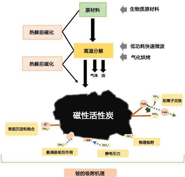 圖1:活性炭生產(chǎn)概述,包括可能的原料和熱解方法的非詳盡示例,以及可能發(fā)生的銨吸附機(jī)制的范圍。