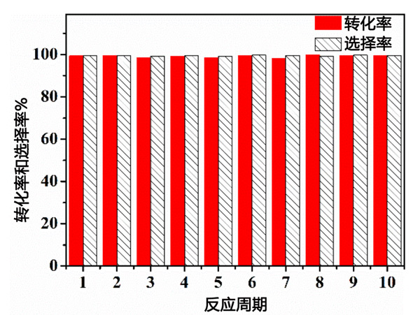 最后通過回收實驗測試了活性炭催化劑的穩(wěn)定性,測試結(jié)果如圖3所示。在催化劑可重復(fù)使用性能的探索中,活性炭催化劑用溶劑環(huán)己烷洗滌,然后進入下一個反應(yīng)循環(huán)。具體過程為將反應(yīng)完成后的固體離心分離出來,再用環(huán)己烷洗滌固體3次,以完全去除前一輪反應(yīng)表面殘留的少量液體。即使在連續(xù)運行10次后,催化劑的性能也沒有顯著降低,仍然達到99%的苯甲醛轉(zhuǎn)化率和99%的選擇性。因此,活性炭催化劑是用于研究苯甲醛乙二醇縮醛反應(yīng)的優(yōu)異且穩(wěn)定的可回收固體酸催化劑。