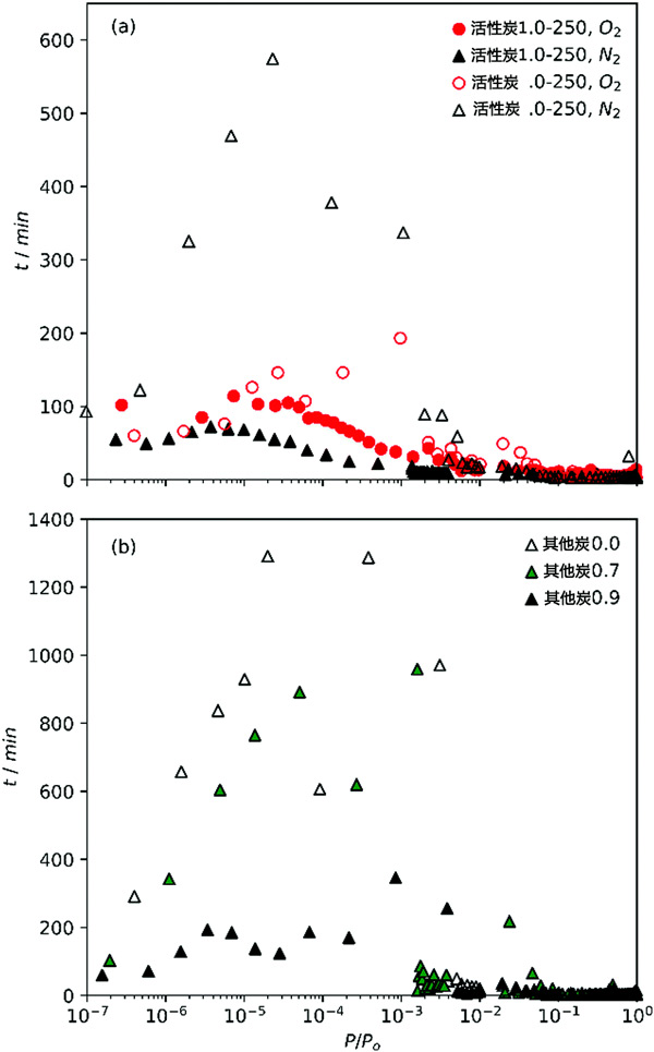 圖1:(a)O2和N2等溫線在活性炭上的相對(duì)壓力增加和(b)N2等溫線其他炭的點(diǎn)之間的時(shí)間。