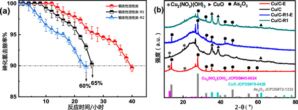 銅改性活性炭通過(guò)水洗和吹掃氣體法進(jìn)行再生。為此,活性炭樣品首先在100℃的熱空氣中活化3小時(shí)。然后用去離子水浸泡清洗4-5次,放入電熱風(fēng)烘箱中110-120℃烘干。之后,將樣品置于氮?dú)鈿夥障碌墓苁綘t中,并使用程序升溫控制器升高溫度?紤]到通過(guò)在180℃下烘烤獲得的材料,溫度首先設(shè)定在20-180℃。之后,停止加熱,將樣品冷卻至室溫。取出樣品,停止氮?dú)饬鳎瑢?duì)再生材料進(jìn)行測(cè)試。如圖3a所示,R的再生效率(R為再生吸附劑與新鮮吸附劑的穿透時(shí)間之比)在一個(gè)再生循環(huán)后為65%。在第二次再生循環(huán)后,樣品恢復(fù)效率R達(dá)到60%,證實(shí)了活性炭吸附劑對(duì)去除AsH3具有合理的再生能力。為了確定活性炭吸附劑再生后表面相的變化,通過(guò)XRD分析活性炭吸附劑。如圖3b所示,再生后活性炭-R1中35.6°、38.8°和61.8°的CuO衍射峰強(qiáng)度明顯增加,但沒(méi)有Cu2(NO3)峰被找到。這表明在再生過(guò)程中回收的一些CuO物種可能被中間體Cu2(NO3)(OH)3轉(zhuǎn)化。此外,活性炭-R1樣品中As2O3在28.0°、32.2°、35.5°、42.6°、46.4°、55.0°和59.6°處的結(jié)晶峰明顯減弱。推測(cè)中間體Cu2(NO3)(OH)3向吸附活性中心CuO的轉(zhuǎn)變和結(jié)晶As2O3的分離可能是活性炭吸附劑再生性能好的原因。