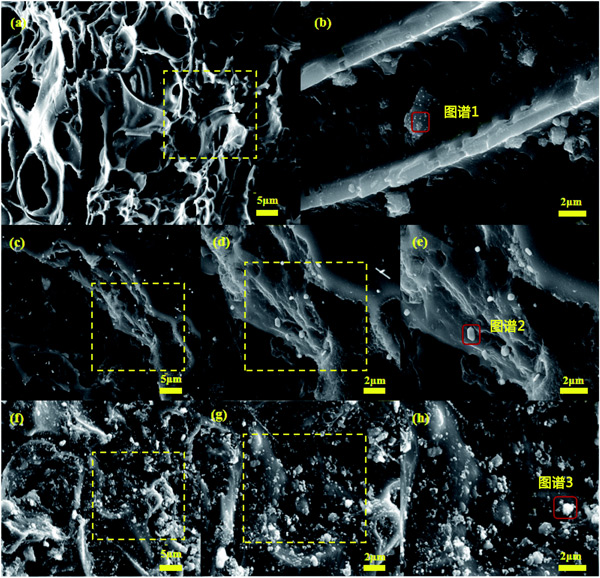 活性炭和鋅鹽失活催化劑的SEM圖像在圖2顯示。從圖2a和b可以看出,載銅活性炭催化劑具有良好的孔結(jié)構(gòu),不同尺寸的金屬氧化物顆粒分布在催化劑表面。放大5000倍后(圖2b),有利于反應(yīng)氣體吸附的孔結(jié)構(gòu)仍清晰可見。圖2c-e顯示ZnCl2-活性炭催化劑的大部分表壁坍塌,孔結(jié)構(gòu)嚴(yán)重受損,表明ZnCl2摻雜后活性炭結(jié)構(gòu)強(qiáng)度降低。圖2f-h表明ZnSO4-活性炭催化劑基體受到一定程度的破壞,表面粗糙,孔隙結(jié)構(gòu)幾乎看不到,僅在某些位置附著較大的金屬氧化物顆粒,局部堆積。這種團(tuán)聚現(xiàn)象發(fā)生在ZnSO4摻雜后的催化劑表面,不利于CO和NO氣體的吸附,導(dǎo)致脫硝活性下降。