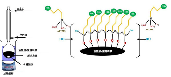 為了改性活性炭的表面,將15g非常細(xì)的干燥活性炭粉末與300mL甲苯和2mL氨丙基三甲氧基硅烷(APTMS)溶液在磁力攪拌下在40℃惰性環(huán)境下混合24小時。圖1表示實(shí)驗(yàn)裝置的示意圖。使用實(shí)驗(yàn)室旋轉(zhuǎn)蒸發(fā)儀去除溶劑。用甲苯和丙酮進(jìn)一步洗滌所得的APTMS活性炭,然后在60℃下真空干燥6小時。這種干燥的活性炭被稱為改性活性炭,由表面上的胺官能團(tuán)組成。改性活性炭在干燥條件下儲存以用于后續(xù)的實(shí)驗(yàn)工作。