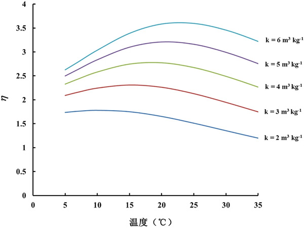查看活性炭的檢測器的結(jié)果(圖2)可以看出,相同溫度下的CF0在活性炭之間存在差異。這意味著不同活性炭的吸附能力存在一些差異。在所有模塊設(shè)計中,假設(shè)21℃下的吸附容量值為4m3/kg-1。然而,由于我們的實驗結(jié)果表明不同活性炭材料的k可能存在差異。不同k值的結(jié)果如圖3所示。可以看出,對于區(qū)間2-6m3/kg-1內(nèi)的所有k值,η的變化(例如最大/最小比率)與溫度的變化遠(yuǎn)小于未包裝傳感器觀察到的230-305%的變化。