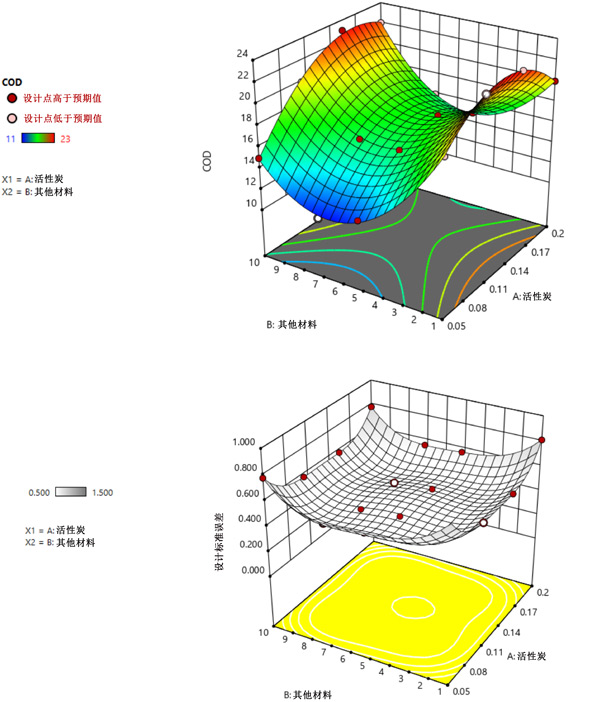 圖1:用于活性炭工藝的有效實驗變化與COD去除的3D圖和標(biāo)準(zhǔn)誤差。