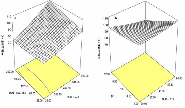圖3:雙酚A去除效率對(duì)磁力活性炭影響的響應(yīng)面3-D(a)pH和劑量以及(b)pH和溫度。