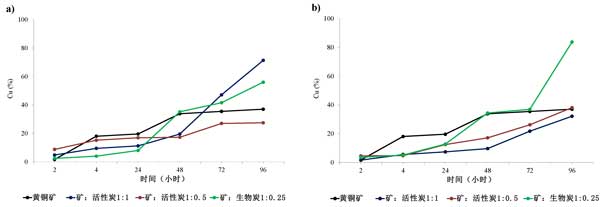 圖1:浸出液中銅萃取的演變(a)活性炭和(b)生物炭。