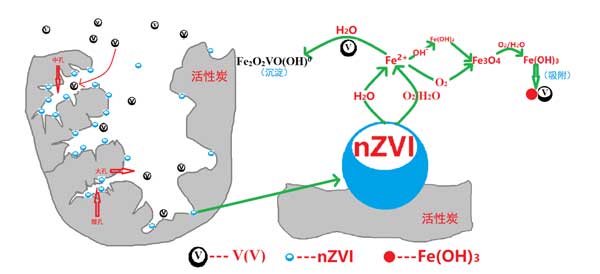 圖3:活性炭載納米零價鐵從水中去除釩的機制。