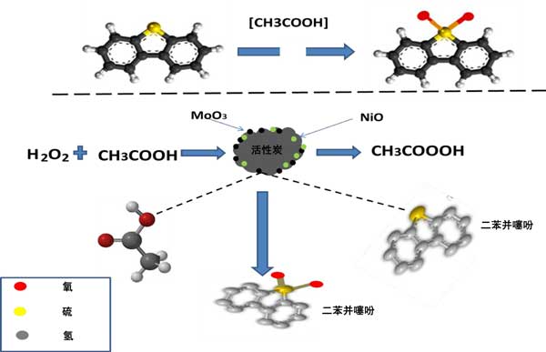 為了更好地理解H2O2/CH3COOH體系在NiO-MoO3活性炭催化劑存在下的氧化脫硫機(jī)理,假設(shè)存在NiO作為助催化劑,而MoO3作為活性相,反應(yīng)由MoO3引發(fā),涉及過(guò)氧化氫的水解裂解產(chǎn)生強(qiáng)氧化劑(活性羥基自由基(OH•),這些活性自由基攻擊乙酸產(chǎn)生過(guò)乙酸,為二苯并噻吩提供氧氣生產(chǎn)二苯并(含有S=O)并進(jìn)一步攻擊產(chǎn)生二苯并噻吩(含有O=S=O)。