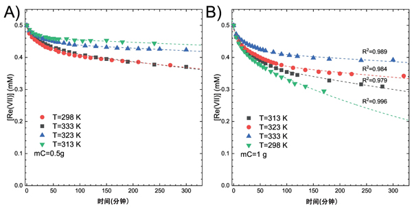 圖2顯示了溶液Re(VII)的初始濃度=0.5mM在不同溫度和活性炭量下的動力學(xué)曲線。圖2A和B顯示了當(dāng)每200cm3溶液分別使用0.5和1g活性炭時(shí)的濃度變化。溶液中使用的活性炭量越大,Re(VII)濃度的降低越顯著。這種趨勢歸因于吸附劑的大比表面積,這導(dǎo)致了大容量。碳含量加倍使表面積加倍。