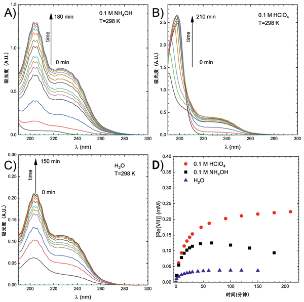 對于解吸研究,在25℃吸附后,200cm3溶液使用1g活性炭。Re(VII)離子的初始濃度為0.5mM。吸附后,將樣品分成三部分。然后在三種環(huán)境中進(jìn)行解吸,即0.1M/HClO4、0.1M/NH4OH和H2O。在所有情況下,每50cm3液體使用0.3g活性炭。UV-Vis光譜和動力學(xué)曲線如圖4。