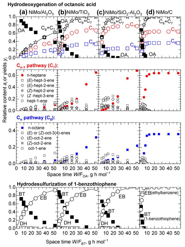 圖2:在辛酸和1-苯并噻吩的平行HDO/HDS過程中活性炭催化劑。