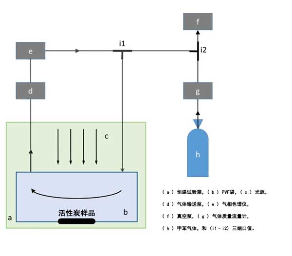 系統(tǒng)研究了活性炭復(fù)合材料的光催化性能。為了模擬實(shí)際應(yīng)用,在恒溫試驗(yàn)箱中將不銹鋼罐替換為60L聚氟乙烯袋,并保持恒溫(例如20℃)。然后,將3g活性炭微粒放在盤子上并放入袋中。入射光可以穿過(guò)PVF薄膜到達(dá)活性炭表面。其結(jié)構(gòu)如圖1所示。為了測(cè)試光催化活性,反應(yīng)器首先用泵抽真空。然后,注入60L甲苯氣體(空氣中50.0ppm)作為目標(biāo)室內(nèi)污染物。這需要大約12分鐘。之后,將反應(yīng)器在黑暗中保持0.5小時(shí)以達(dá)到吸附/脫附平衡。使用300W氙氣燈作為模擬日光源。使用氣相色譜儀定期分析反應(yīng)器中的氣體產(chǎn)物。此外,口袋中的甲苯氣體還不能完全流到氣相色譜儀的自動(dòng)氣體進(jìn)樣閥,因?yàn)樵撻y的管徑比較小,輸氣泵剛剛啟動(dòng)。因此,甲苯濃度低。