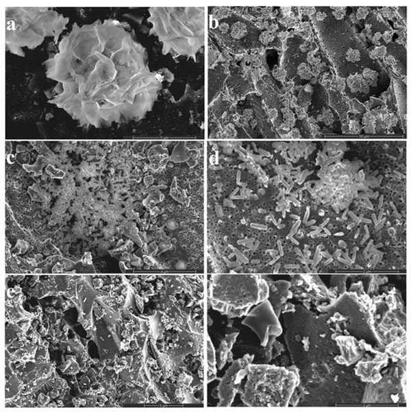 圖2:(a-d)不同含量負(fù)載的活性炭復(fù)合材料和活性炭(e-f)的SEM圖像。