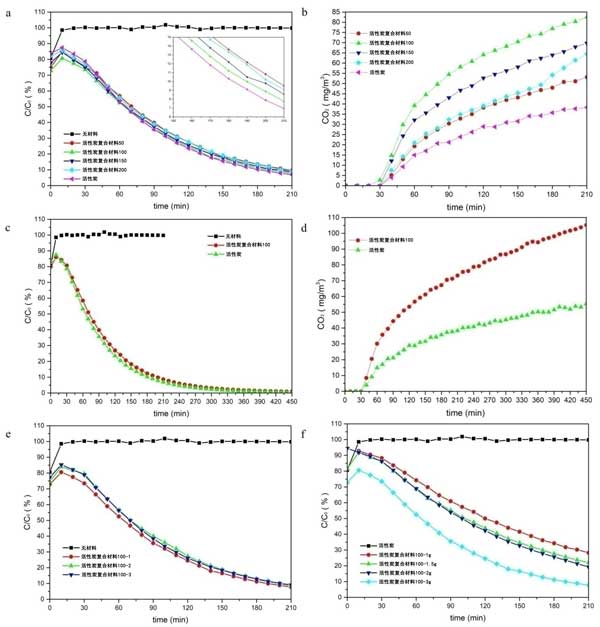 圖3:活性炭樣品去除空氣中甲苯的光催化性能(a)樣品的CO2產(chǎn)率(b)活性炭復(fù)合材料和活性炭去除甲苯的性能(c)CO2產(chǎn)率(d)三個(gè)循環(huán)的穩(wěn)定性(e)不同用量活性炭復(fù)合材料的甲苯去除效率(f)。