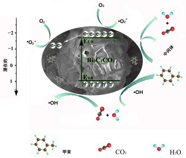 活性炭復(fù)合材料在光照射下降解氣態(tài)甲苯的光催化反應(yīng)機(jī)制可以解釋如下(圖4)。首先,蜂窩狀活性炭基質(zhì)吸附并捕獲甲苯分子。然后,在光照下,電子從價(jià)帶(VB)激發(fā)到負(fù)載Bi2O2CO3的活性炭表面的導(dǎo)帶(CB),在VB中留下空穴。活性炭可以充當(dāng)電子受體以降低電子-空穴對(duì)的復(fù)合率。因此,Bi2O2CO3中CB上的激發(fā)電子可以很容易地轉(zhuǎn)移到活性炭表面,從而促進(jìn)光生電荷載流子的分離和遷移。