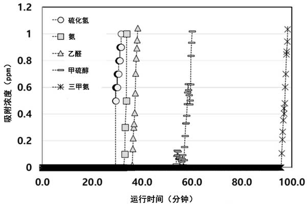 為了評估活性炭對不同廢氣的有效吸附量,應研究其吸附能力。廢氣的氣味閾值和刺激水平在十億分之一的水平。吸附劑的總吸附容量很難用作從廢物中去除廢氣的設備的設計因素。因此,我們根據(jù)突破點計算了小于1ppm的有效吸附量。突破柱實驗在304不銹鋼管式反應器中進行,總流量為1L/min,其中包含硫化氫(H2S)、氨(NH3)、乙醛(AA)、甲硫醇(MM)和三甲胺(TMA),如圖2所示。突破曲線依次為H2S、NH3、AA、MM、TMA。與廢氣相比,TMA具有更好的動態(tài)吸附性能,因為它具有更長的突破時間和相應的更大的有效吸附容量(<1ppm)。