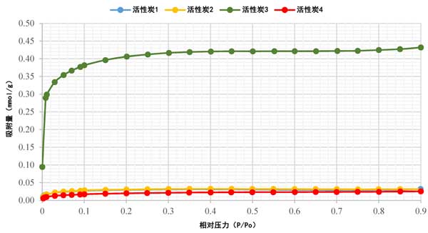 活性炭的吸附等溫線(xiàn)已使用氮(N2)吸附分析技術(shù)(一種標(biāo)準(zhǔn)方法)進(jìn)行了研究。圖2顯示了活性炭在77K時(shí)的N2吸附等溫線(xiàn),該等溫線(xiàn)被發(fā)現(xiàn)為I型等溫線(xiàn)。N2吸附在低相對(duì)壓力范圍內(nèi)的快速上升證實(shí)了所有樣品都存在小孢子,如圖2所示。很明顯,活性炭4具有最低的N2吸附,而活性炭1和活性炭2的吸附等溫線(xiàn)重疊,活性炭3具有最高的N2吸附。數(shù)據(jù)的這種可變性可能歸因于所使用的不同前體材料。此外,除活性炭3外,活性炭的大部分孔隙體積都填充在P/Po≈0.1以下。對(duì)于活性炭3,孔體積填充低于P/Po≈0.3。在初始增加到0.1后,等溫線(xiàn)逐漸彎曲,表明進(jìn)一步吸附的增量較小。隨著相對(duì)壓力的增加,所有樣品的吸附幾乎呈水平狀態(tài),表明已經(jīng)達(dá)到飽和。