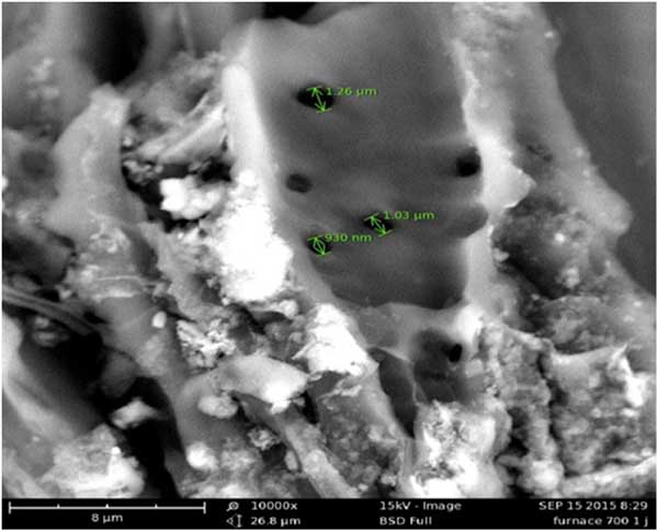 由于上述陶瓷膜去除污染物的多重優(yōu)勢和有前途的特性,分析陶瓷膜中不同活性炭和氧化鐵粉末含量的影響。使用掃描電子顯微鏡研究活性炭材料的微觀結構。圖1描繪了使用ZnCl2/50vol%在10,000倍放大倍數下活化后的活性炭的孔隙。發(fā)現活性炭的孔徑顯示尺寸范圍在0.93μm–1.26μm之間。