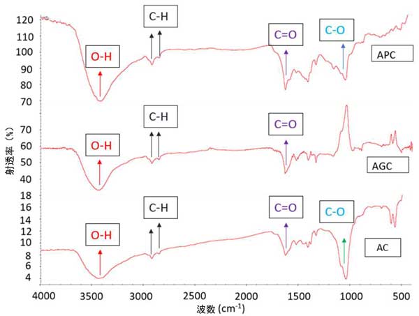 圖1:三種活性炭的FTIR光譜。