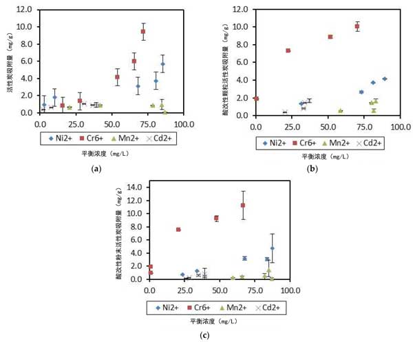 圖2:金屬離子在不同吸附劑上的吸附等溫線(a)活性炭,(b)酸處理顆粒活性炭,和(c)酸處理粉末活性炭。