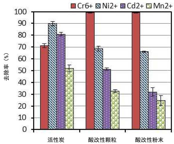 顆粒活性炭的酸處理與未處理的活性炭相比,Cr6+去除效率提高了30%,而Ni2+、Mn2+和Cd2+分別降低了23%、36%和37%。這可以通過與其他離子相比更高的離子勢(shì)和Cr6+的小尺寸來解釋。這將導(dǎo)致Cr6+對(duì)酸性表面基團(tuán)的吸引力更強(qiáng),并更快地?cái)U(kuò)散到活性炭的孔隙中。高正電的Cr6+離子會(huì)吸附在孔隙邊緣的酸性功能位點(diǎn)上,排斥其他較弱的重金屬離子,降低它們對(duì)活性炭孔隙的可及性。