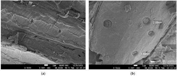 使用FESEM分析觀察了活性炭產品的浸漬和碳化溫度影響的形態(tài)變化。圖1a、b描繪了木質素在被激活之前的表面形態(tài)。它顯示出厚而平坦的圖案,中間有小裂縫。這歸因于大量的木質素,一種酚類聚合物,賦予植物結構強度,使其具有堅硬粗糙的木材狀結構。在圖1b中,發(fā)現(xiàn)前體具有壓實的表面,上面有淺而堵塞的孔隙圖案。這可能是由于烘箱干燥過程中預處理和加熱過程的反應。從圖1a、b,由于無孔表面的存在,表面清楚地顯示為不令人滿意的吸附材料。