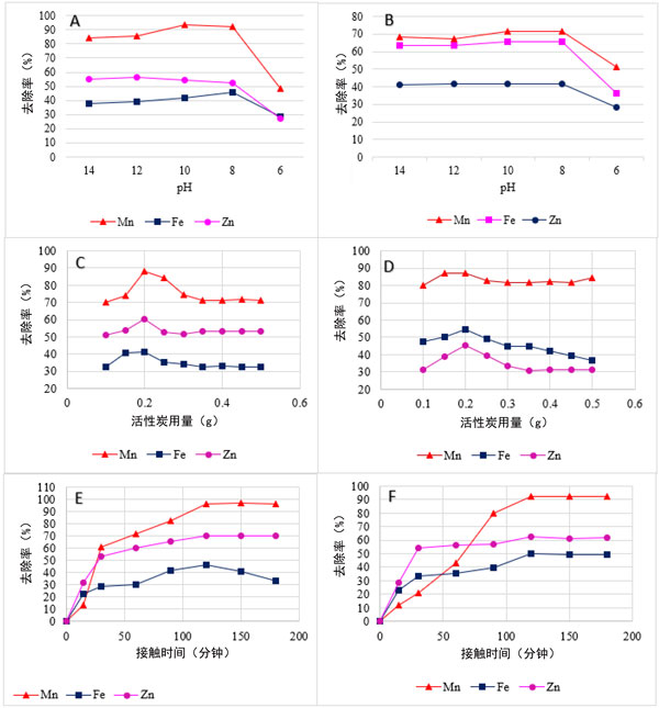 在分批吸附研究中,pH值是一個重要因素,它會通過改變所用吸附劑的表面電荷分布來影響吸附過程。在6和14的范圍內觀察到木材加工廢水中重金屬(Mn、Fe和Zn)的pH相關影響。圖3A、B清楚地表明,當纖維板加工廢水中的Mn、Fe和Zn分別使用pH8時,兩種活性炭均獲得最佳結果。