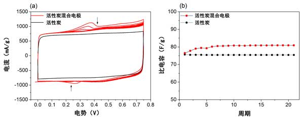 通過評估電化學(xué)性能,初步測試了活性炭復(fù)合材料作為混合電極的潛在應(yīng)用。為此,通過將浸泡在1M/H2SO4電解質(zhì)中的隔膜夾在兩個相同的電極(活性炭或混合材料)之間來組裝對稱電池。圖3a顯示了活性炭和混合材料在20mV/s恒定掃描速率下的循環(huán)極化(CP)曲線。由于雙電層電容(EDLC)的影響,交流對稱電池的CP曲線形狀為矩形。另一方面,活性炭混合電極觀察到準(zhǔn)矩形CP曲線NPs對稱細(xì)胞,具有源自納米銀的各種氧化還原波,與矩形(電容)包絡(luò)重疊。這種CP結(jié)構(gòu)表明法拉第和EDLC兩種電荷存儲機(jī)制的共存。值得注意的是,隨著循環(huán)次數(shù)的增加,觀察到的銀波變得更小并且變得難以察覺,這表明存在一定程度的不穩(wěn)定,正如對游離多金屬氧酸鹽納米銀所觀察到的那樣。白銀波浪的減少之間存在相關(guān)性(圖3a)在前幾個周期內(nèi),根據(jù)CP面積計算出的比電容有所增加(圖3b)。這可以通過氧化銀薄層與銀的比電容差異來解釋。盡管如此活性炭混合電極的比電容略高于裸活性炭電極,活性炭的比電容為75F/g,活性炭混合電極在20次循環(huán)后達(dá)到81F/g。該結(jié)果表明,混合材料具有電活性,并且在對稱超級電容器配置中超過了一定程度的交流電;钚蕴亢突旌想姌O電池的比電容隨著電流密度的增加而降低。對于活性炭混合材料在掃描速率為2mV/s時最高值為83.5F/g,在掃描速率為50mV/s時進(jìn)一步下降至77.5F/g。高掃描速率下比電容的降低歸因于電解質(zhì)離子的低擴(kuò)散。由于時間限制,高倍率充放電過程中電解液中的離子運(yùn)動始終受到擴(kuò)散限制,僅利用外層活性表面進(jìn)行電荷存儲。減慢掃描速率可以讓電解質(zhì)更徹底地滲透到孔隙中,并與電極材料的內(nèi)表面有更多的接觸,從而導(dǎo)致電極表面存儲更多的電荷(更大的電容)。