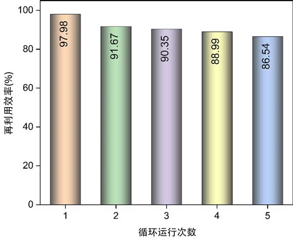 吸附劑的可重復(fù)使用性和吸附穩(wěn)定性在評估所開發(fā)方法的實際適用性方面起著至關(guān)重要的作用。事實上,吸附劑的可重復(fù)使用性能是實際應(yīng)用的首要標準,并影響吸附過程的總體成本;钚蕴勘秸羝降脑倮眯适窃谖鍌連續(xù)的回收循環(huán)后確定的。如圖4所示,經(jīng)過五次連續(xù)回收過程后,活性炭苯蒸氣的再利用效率為86.54%。強大的可重復(fù)使用性和吸附穩(wěn)定性表明活性炭吸附劑和苯吸附物之間存在范德華力或π-π相互作用。相反,不完全的再生過程可歸因于吸附表面上永久鍵的形成,導致吸附基團的不可逆轉(zhuǎn)化。換句話說,一些在再生過程中未解吸的化學結(jié)合吸附物可能會堵塞孔隙,導致殘留物形成。