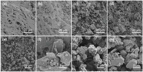 圖2:(a)活性炭、(e)分子篩、(b,f)活性炭復(fù)合材料-10%在不同放大倍數(shù)下的SEM圖像,(c,g)活性炭復(fù)合材料-20%在不同放大倍數(shù)下的SEM圖像,以及(d,h)活性炭復(fù)合材料-30%在不同放大倍數(shù)下的SEM圖像。