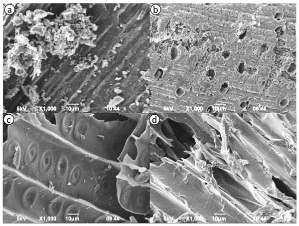 圖1a-d顯示了來(lái)自不同植物來(lái)源的活性炭樣品的形貌SEM圖像。圖像突出顯示了樣品表面結(jié)構(gòu)和孔隙率的明顯差異。圖1a顯示了粗糙的表面,表面具有高密度的不規(guī)則、未受干擾的顆粒。大量裂紋和裂縫的存在表明多孔結(jié)構(gòu)發(fā)達(dá)。圖1b顯示出類(lèi)似的多孔形貌,具有廣泛的薄膜狀結(jié)構(gòu)和大空隙,表明活化和孔隙形成效率高。