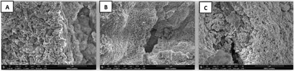 圖1:吸附(A)鍶(B)鋇(C)二元污染物后25,000x下活性炭的SEM圖像。